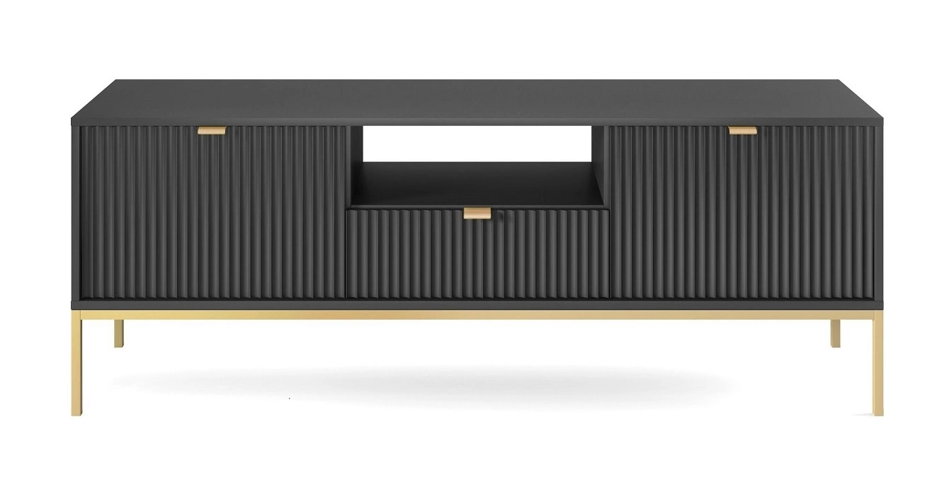 - Der RTV-Schrank von Lovro hat ein modernes Design, so dass er sowohl in das Wohnzimmer als auch in das Jugendzimmer passt. Der schwarze Korpus in Kombination mit goldenen Accessoires ist ideal für Loft- und Industrieumgebungen sowie für glamouröse Innenrä