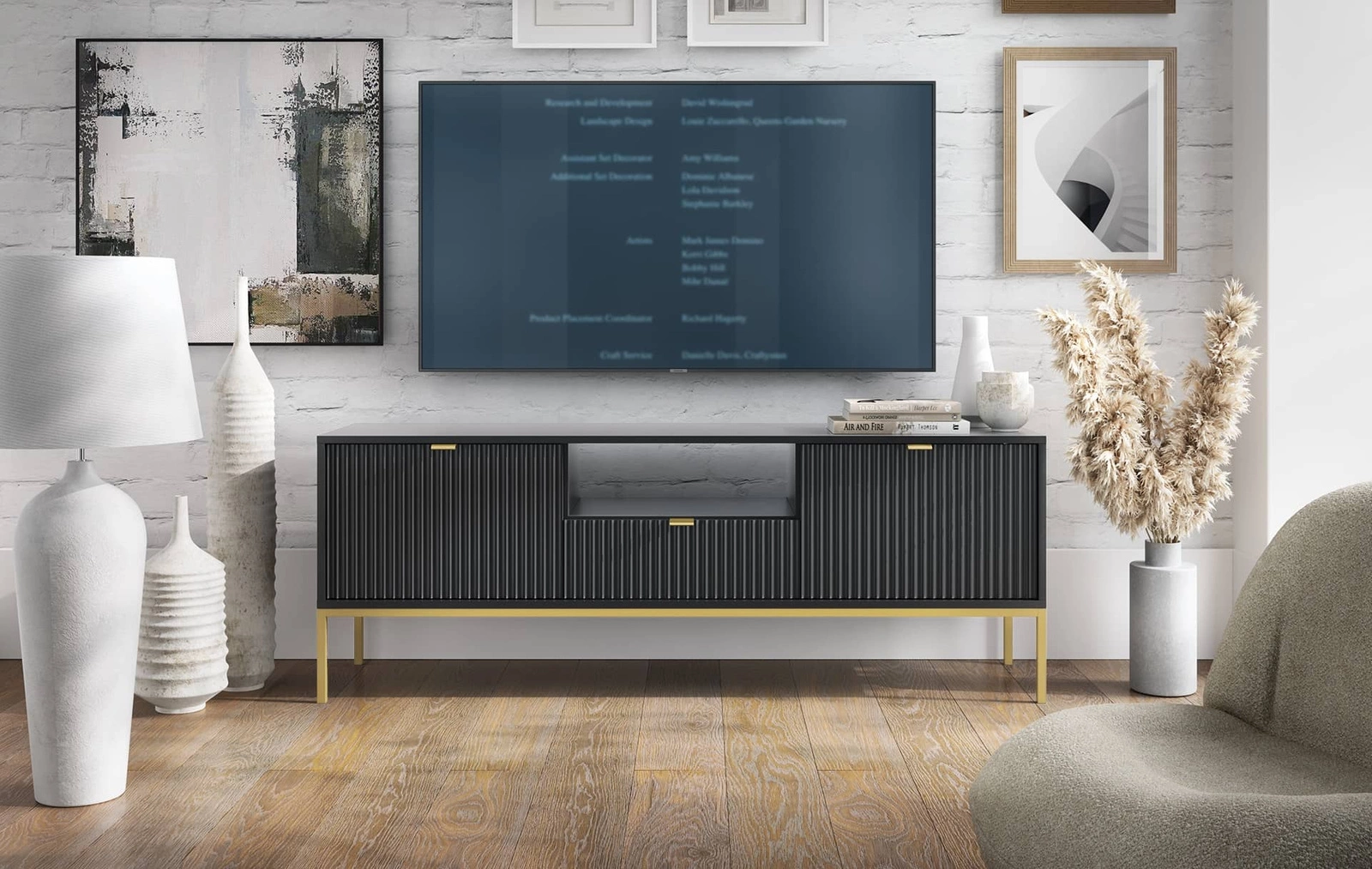 TV Schrank Lovro 154 cm schwarz modernes Design wird die Liebhaber von markanten Interieurs begeistern goldenen Metall-Accessoires