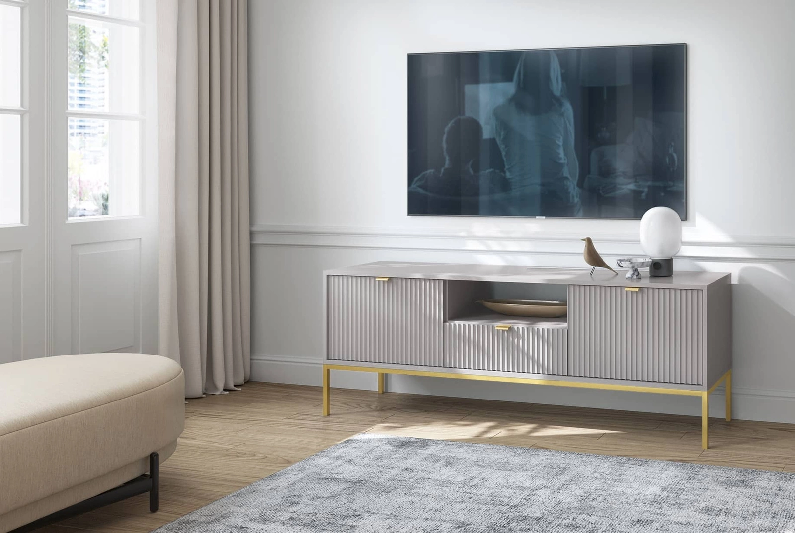 - Der RTV-Schrank von Lovro hat ein modernes Design, so dass er sowohl in das Wohnzimmer als auch in das Jugendzimmer passt. Der graue Korpus in Kombination mit goldenen Accessoires ist ideal für Loft- und Industrieumgebungen sowie für glamouröse Innenräume