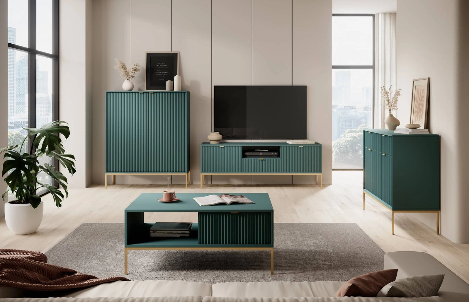 Geriffelt fschubladenbeschläge aus MDF mit einer Dicke von 18 mm verleiht einen besonderen Charme. Ein stilvoller Abschluss der Fronten sind goldfarbene Kantengriffe. Die Struktur der Möbel wurde mit mit Gold metallbeine 20 cm hoch.