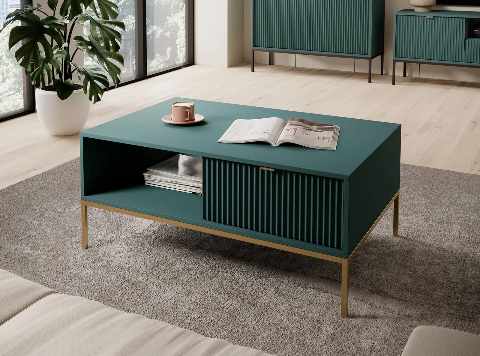 Couchtisch Lovro pastellgrün mit Schubladen modernes Design auslaufsichere Platte goldene Metallbeine