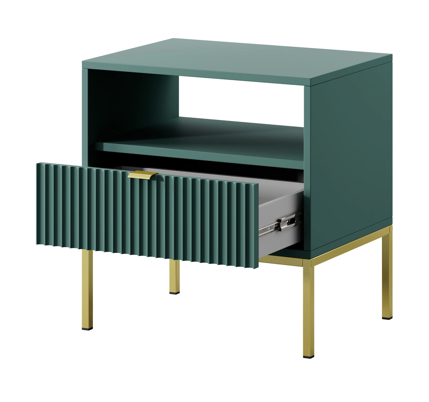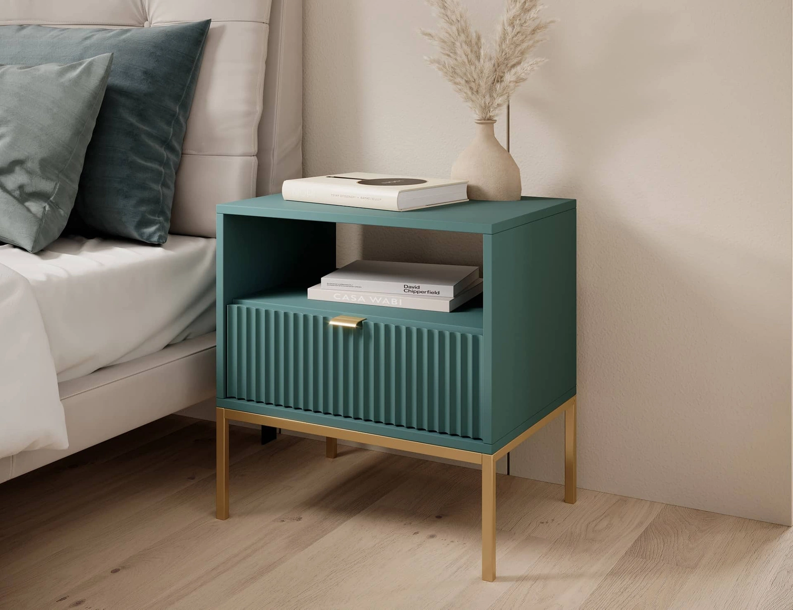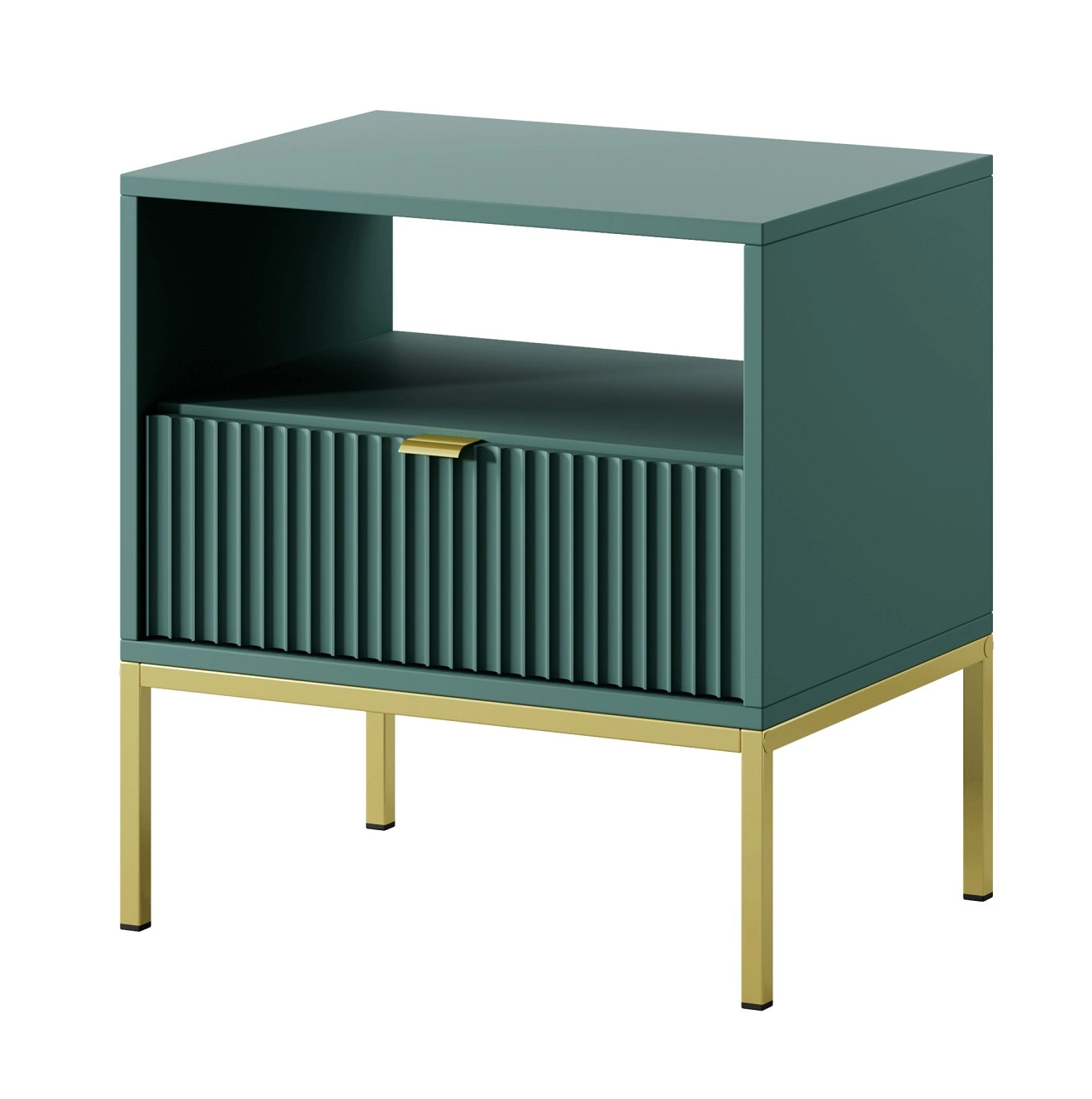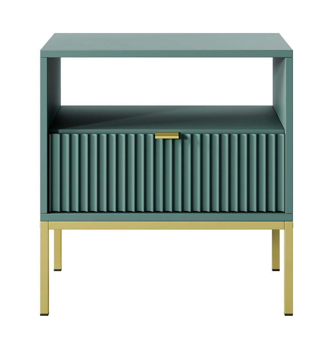 Lovro Nachttisch mit Schublade pastellgrün geschmackvolles geriffeltes Dekor idealer Schlafzimmerschrank goldenes Metallzubehör