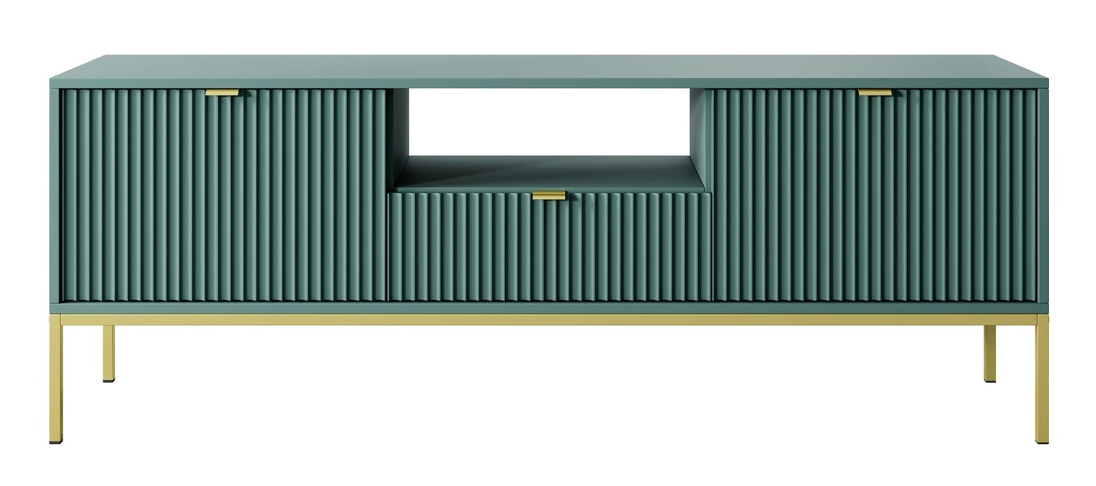 - Der RTV-Schrank von Lovro hat ein modernes Design, so dass er sowohl in das Wohnzimmer als auch in das Jugendzimmer passt. Der grüne Farbton des Korpus, kombiniert mit goldenen Accessoires, ist ideal für Loft- und Glamour-Einrichtungen.