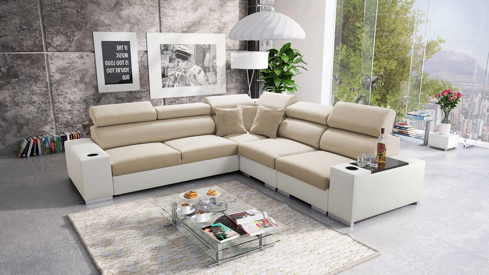 Ecksofa Provo III in Creme/Weiß mit verstellbaren Kopfstützen ist ein elegantes Möbelstück, das sich in jede Einrichtung einfügt.