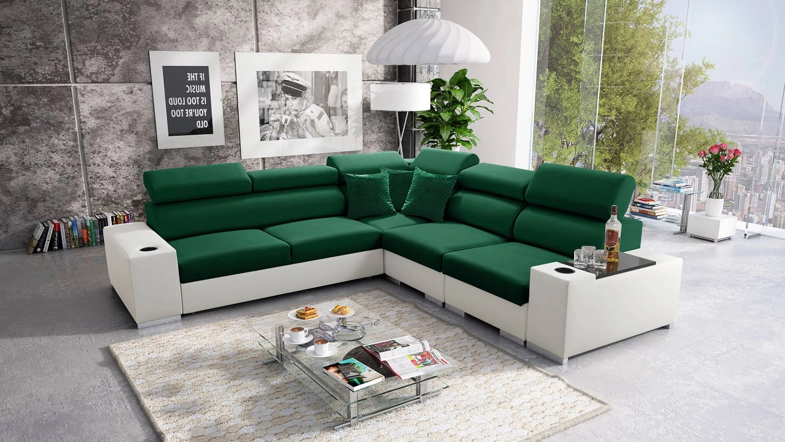 Ecksofa Provo III in Flaschengrün/Weiß mit verstellbaren Kopfstützen ist ein elegantes Möbelstück, das sich in jede Einrichtung einfügt.
