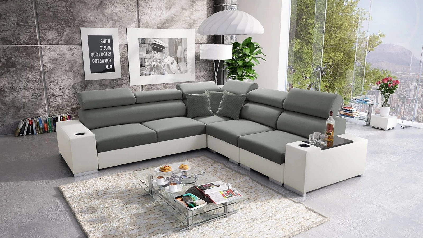 Ecksofa Provo III in Grau/Weiß mit verstellbaren Kopfstützen ist ein elegantes Möbelstück, das sich in jede Einrichtung einfügt.