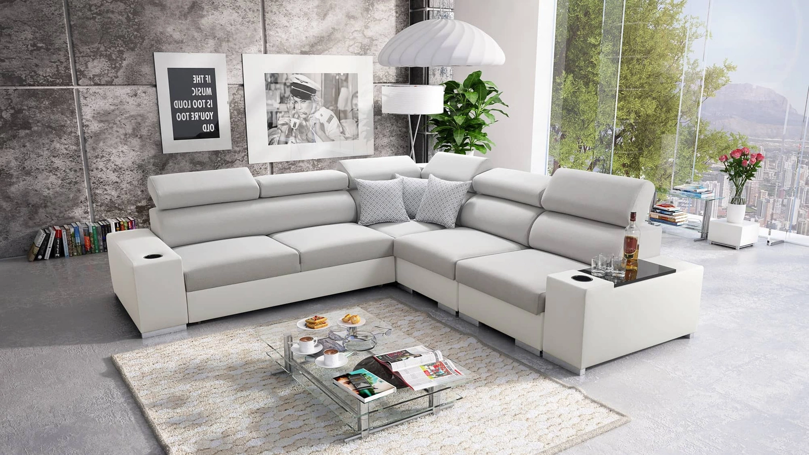 Ecksofa Provo III in Grau/Weiß mit verstellbaren Kopfstützen ist ein elegantes Möbelstück, das sich in jede Einrichtung einfügt.