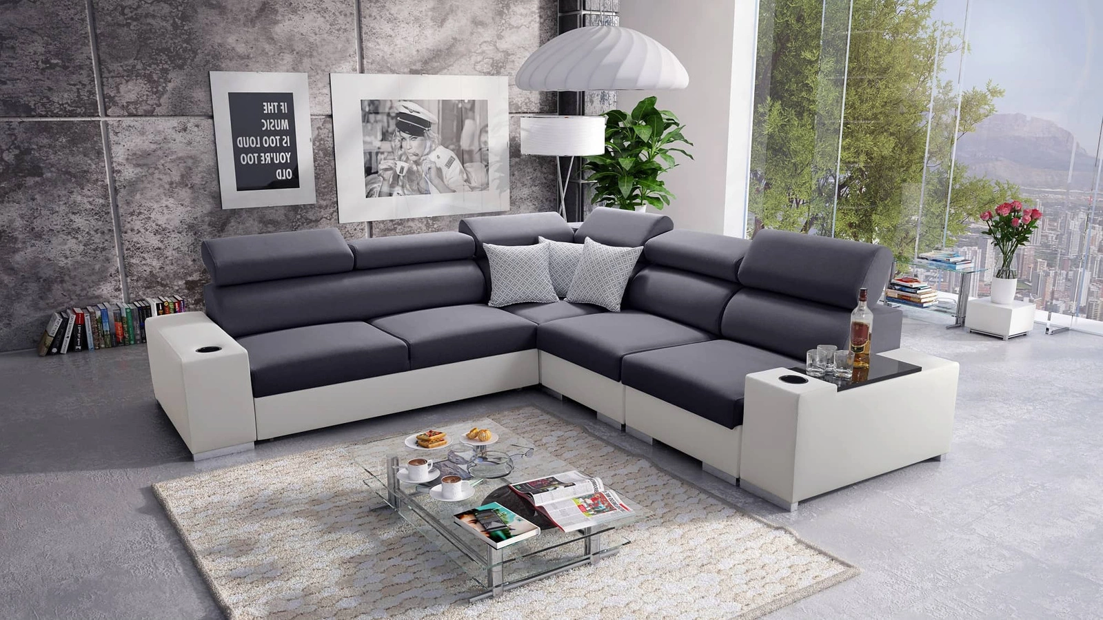 Ecksofa Provo III in Graphit/Weiß mit verstellbaren Kopfstützen ist ein elegantes Möbelstück, das sich in jede Einrichtung einfügt.