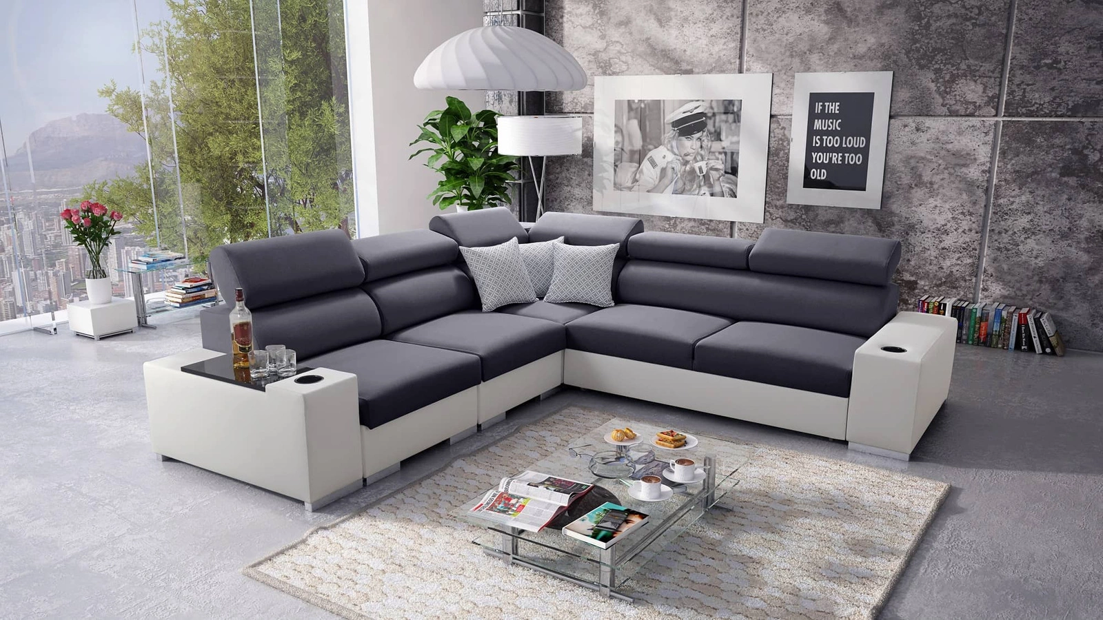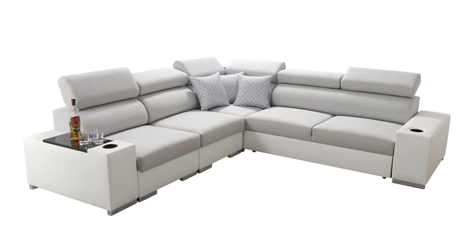 Ecksofa Provo III in Graphit/Weiß mit verstellbaren Kopfstützen ist ein elegantes Möbelstück, das sich in jede Einrichtung einfügt.