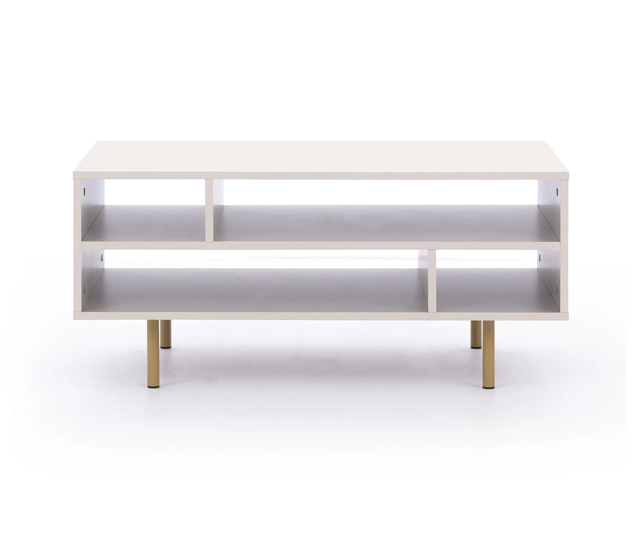 Sula Couchtisch ist eine reizvolle Kombination aus geometrischen Formen und subtile Farben. Beigefarbenr feststoffe perfekt abgestimmt mit hohen Beinen in Goldbeige die dem Couchtisch eine optische Leichtigkeit und Funktionalität verleiht. Offene Regale unter der Arbeitsplatte zusätzlichen Platz schaffen. Das einzigartige Design des Couchtisches funktioniert auch im das anspruchsvollste Interieur.