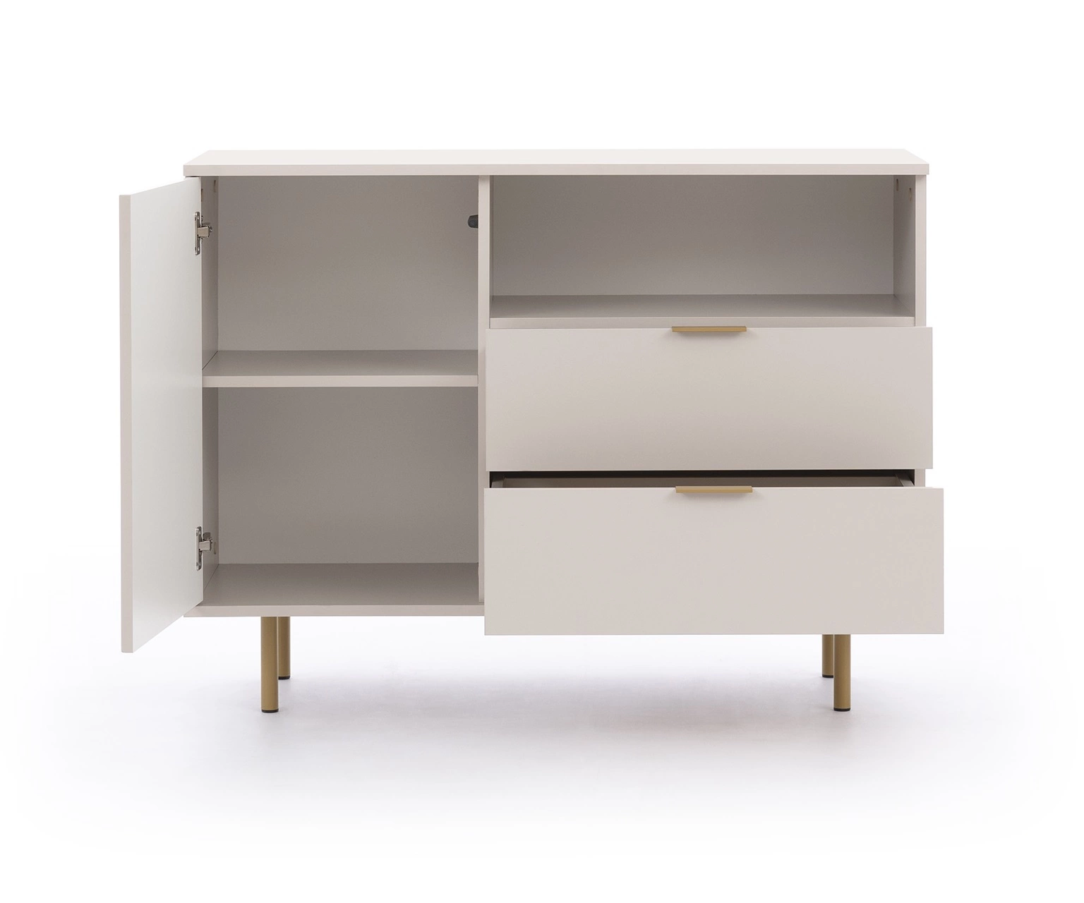 Die Kommode ist gefertigt aus 1 Tür, 2 Schubladen und ein offener Einlegeboden. Die Türen der Kommode werden mit einem grifflosen Push-to-Open-System. Darüber hinaus sind die Schubladen ausgestattet mit schienen mit Retarder. Die verwendeten Systeme erhöhen den Komfort und die Sicherheit der Möbel. Zeitloses Schwarz lässt sich gut mit anderen Farben kombinieren und macht die Kommode Sula zu einer großartigen Wohnkommode, einer Kommode für das Wohnzimmer oder einer Kommode für das Schlafzimmer. Eine Kommode kann auch erfolgreich als Büromöbel eingesetzt werden.