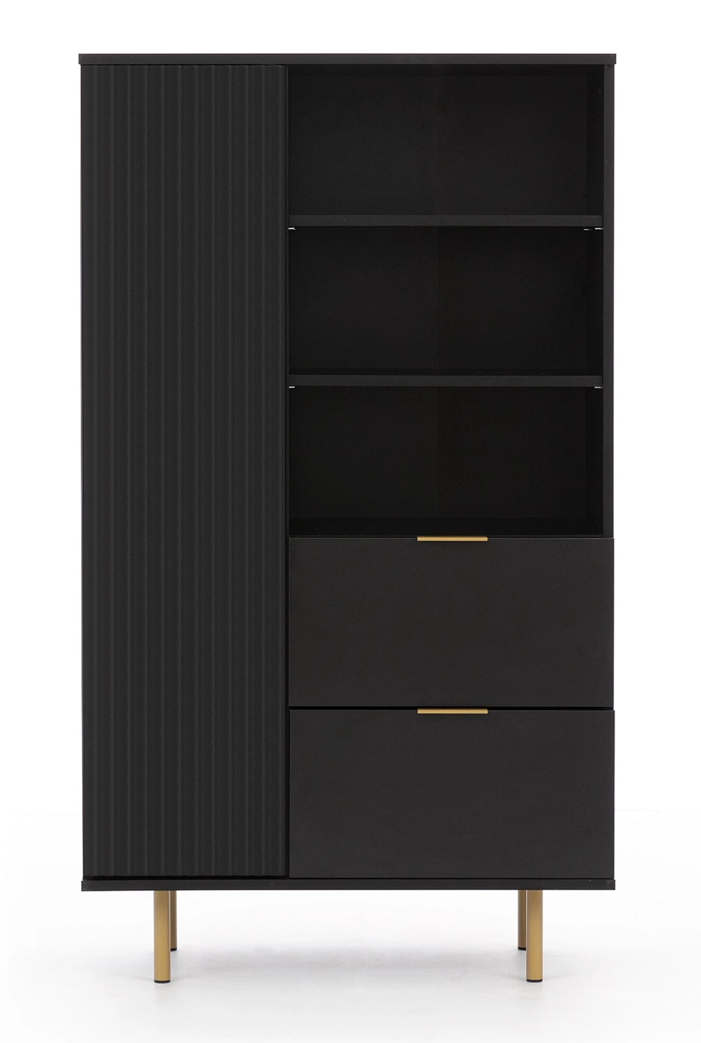 Die Kommode ist gefertigt aus 1 Tür und 2 Schubladen. Die Türen der Kommode werden mit einem grifflosen Push-to-Open-System. Darüber hinaus sind die Schubladen ausgestattet mit schienen mit Retarder. Die verwendeten Systeme erhöhen den Komfort und die Sicherheit der Möbel. Zeitloses Schwarz lässt sich gut mit anderen Farben kombinieren und macht die Kommode Sula zu einer großartigen Wohnkommode, einer Kommode für das Wohnzimmer oder einer Kommode für das Schlafzimmer. Eine Kommode kann auch erfolgreich als Büromöbel eingesetzt werden. Dank offener Raum mit Regalen kann auch als Bücherregal oder Büroeinheit verwendet werden.