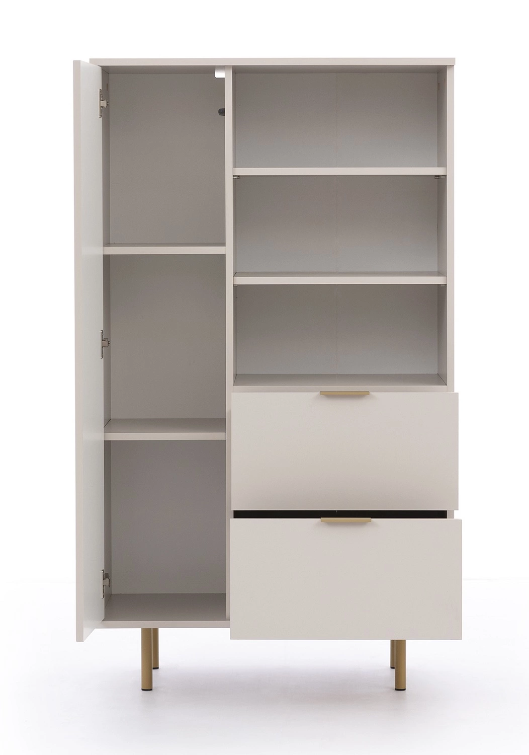- Die hohe Kommode Sula ist eine reizvolle Kombination aus geometrischen Formen und dezenten Farben. Die geriffelte Front und die Griffe mit Goldrand sorgen für Finesse und Eleganz. Die Metallbeine unterstreichen das einzigartige Design des massiven.