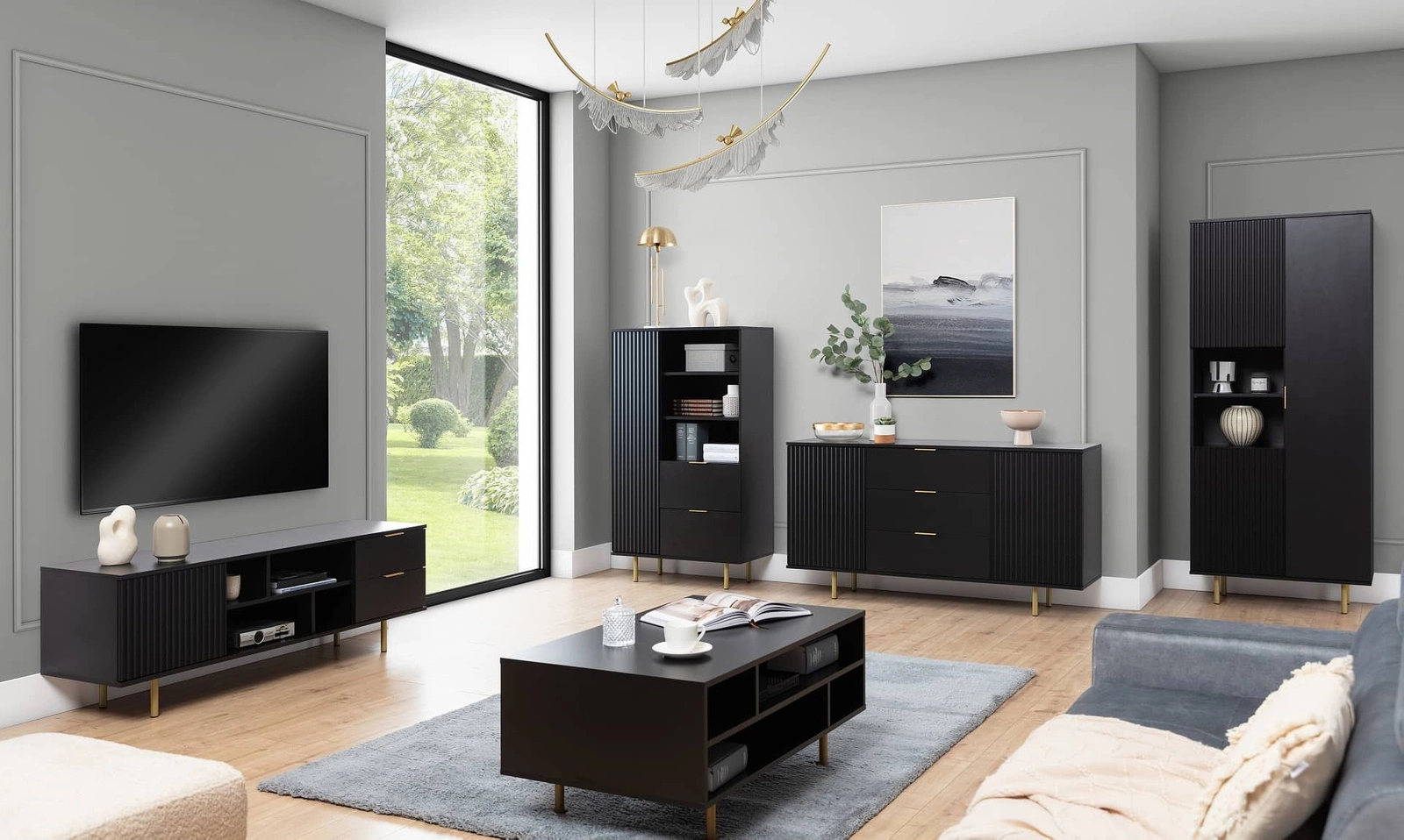 Hochkommode Sula 80 cm schwarz elegante und funktionelle Kommode mit geriffelter Front, die mit Metallgriffen verziert ist