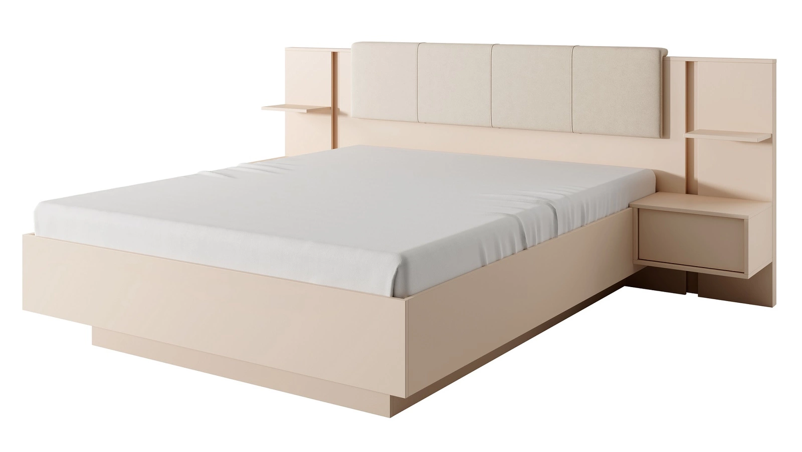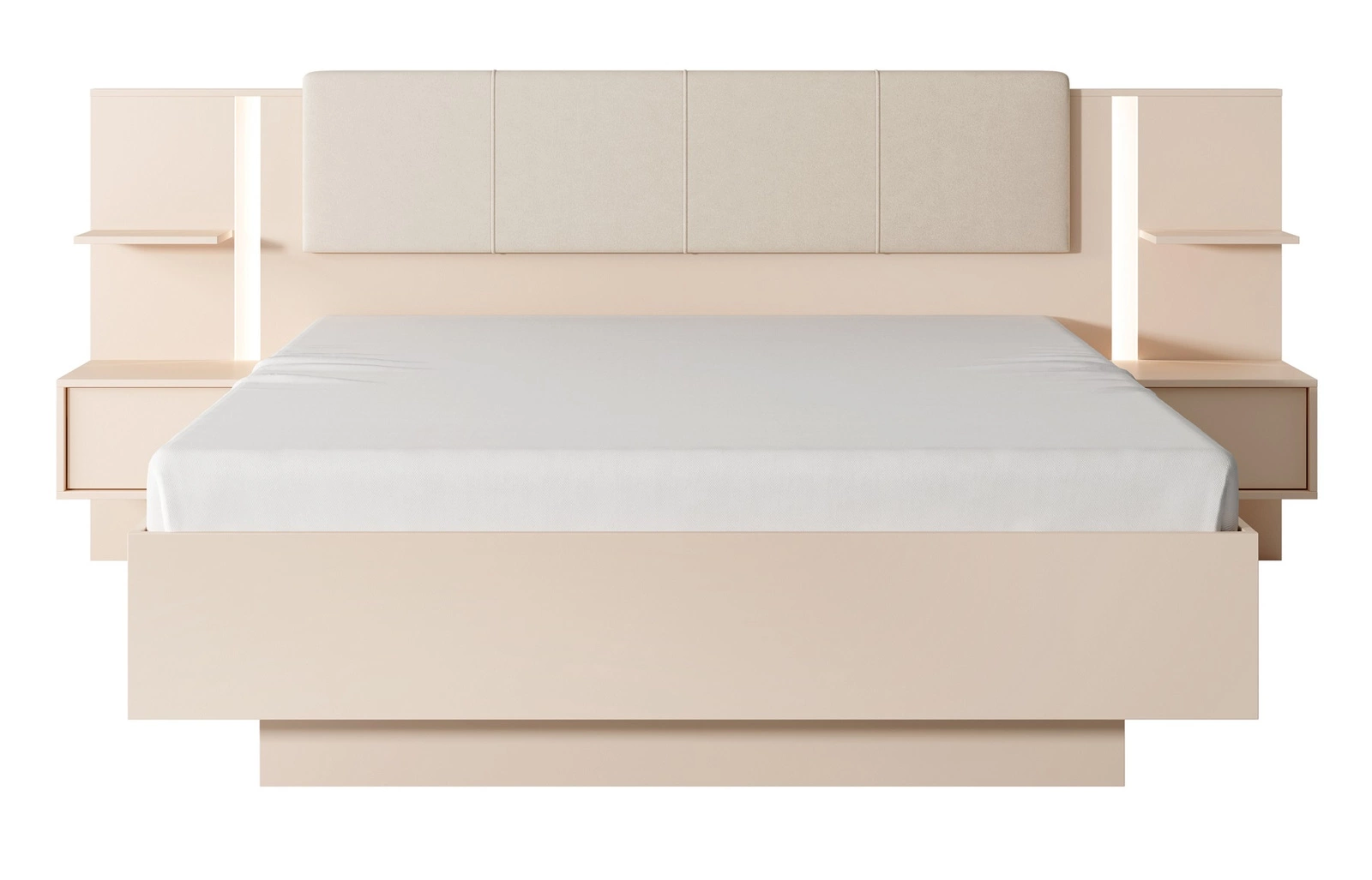 Das Beloit Bett 160x200 cm ist die perfekte Wahl für Menschen, die moderne Lösungen mit subtiler Eleganz schätzen. Die beigefarbene Farbgebung des Möbels schafft eine gemütliche, harmonische Atmosphäre im Schlafzimmer, während der teilweise gepolsterte Kopfteil für Komfort während der abendlichen Entspannung sorgt. Die integrierte LED-Beleuchtung setzt einen modernen Akzent und ermöglicht eine stimmungsvolle Atmosphäre, ohne zusätzliches Licht verwenden zu müssen. Praktische Nachttische sowie der Stauraum für Bettwäsche machen das Beloit Bett nicht nur stilvoll, sondern auch äußerst funktional.