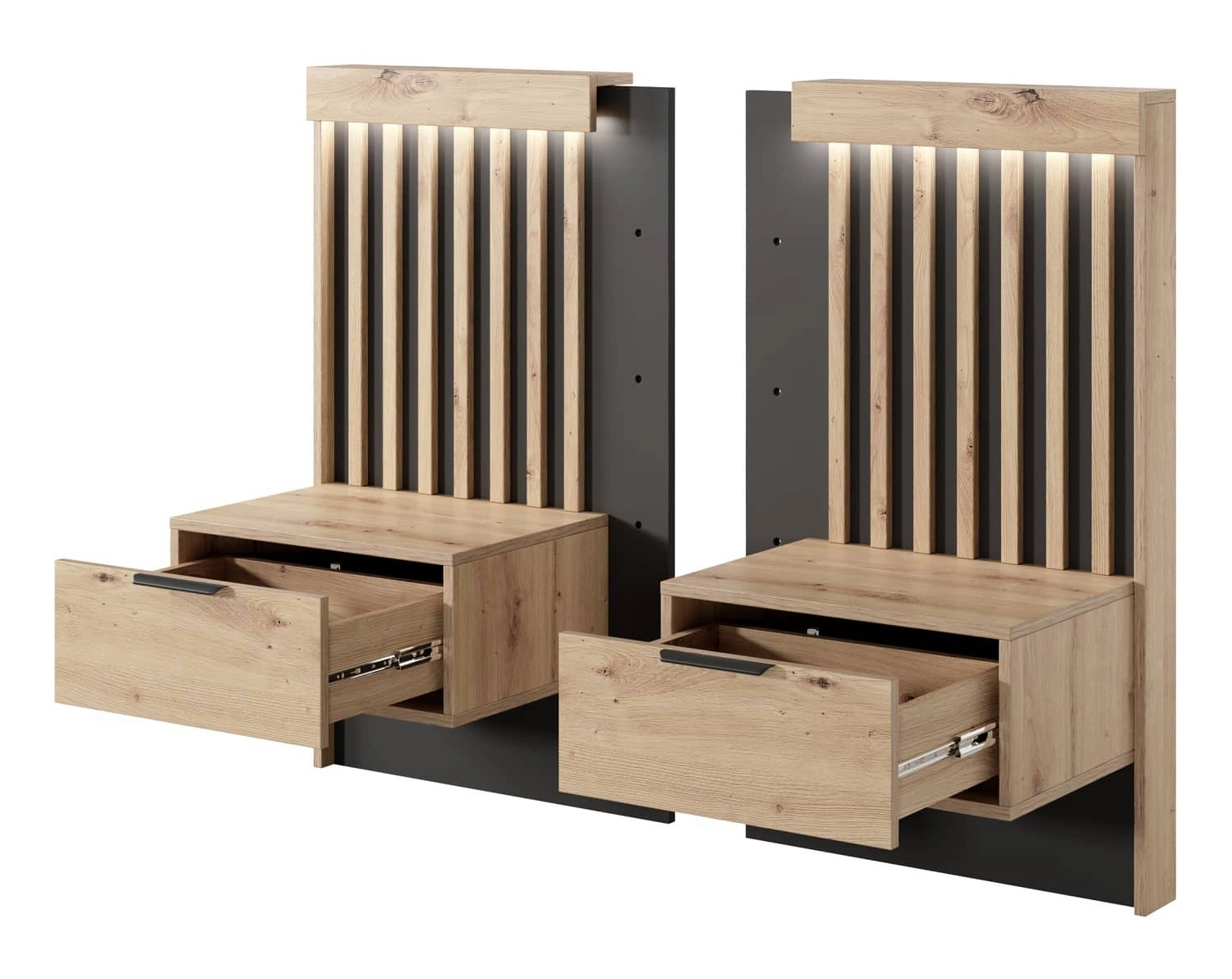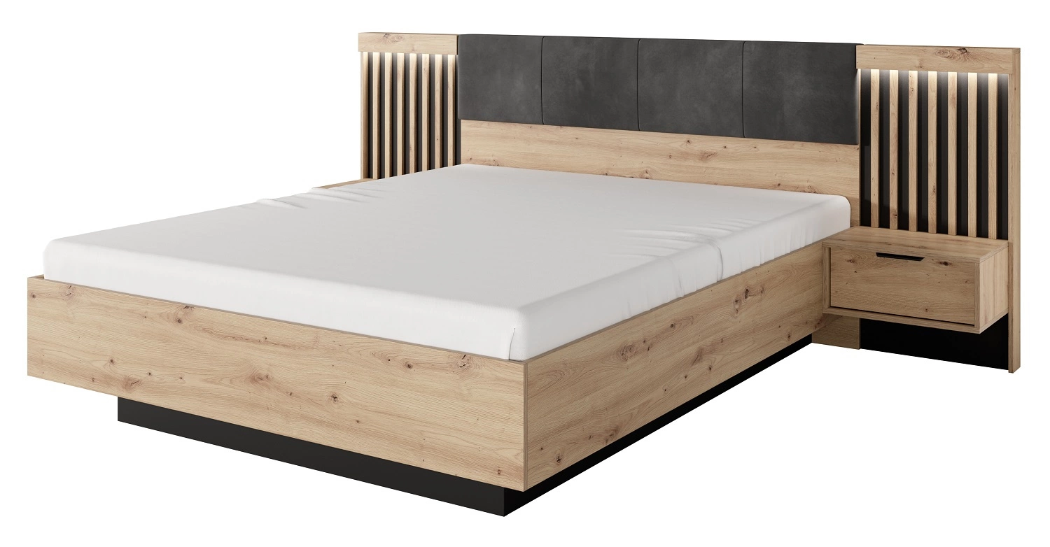 Tipler Bett 160x200 cm mit Bettzeug und Nachttischen Eiche artisan / anthrazit gepolstertes Kopfteil LED-Beleuchtung