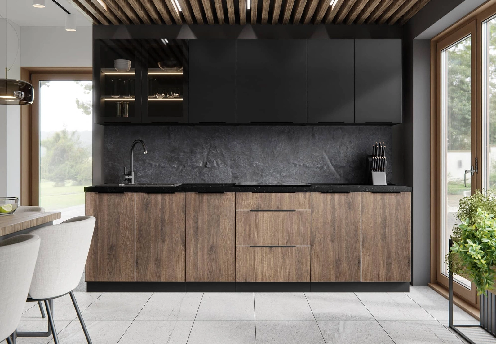 Dank ihrer universellen Positionierung passen die Küchenmöbel in das Innere einer jeden Küche. Schwarze Körper gebrochen mit Fronten walnuss betonen die Eleganz von Küchenschränken. Eine stilvolle Ergänzung zu den Küchenschrankfronten ist die schwarz, metallkantenhalterungen, die zusätzlich zu ihrer Hauptfunktion den Möbeln eine besondere Note verleihen.