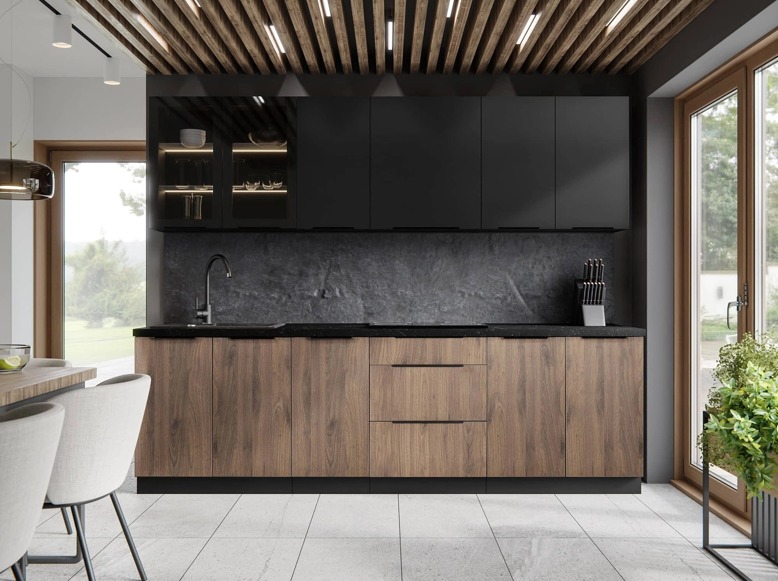• Das Küchenset Black / Brianza ist ein Vorschlag für ein fertiges Set, das sowohl in klassischen als auch in modernen Innenräumen perfekt aussieht. Schwarze Korpusse kombiniert mit Nussbaumfronten geben den Möbeln einen besonderen Charakter.