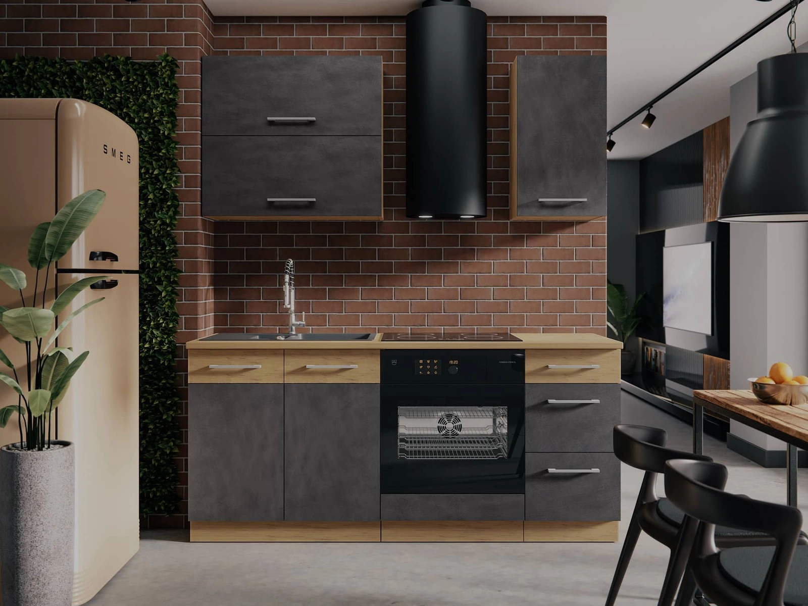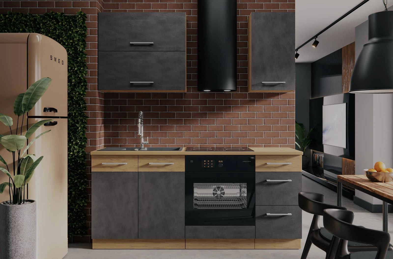 Dank ihrer universellen Positionierung passen die Küchenmöbel in das Innere einer jeden Küche. Mattfarbene Fronten und Korpusse im Eichendekor verleihen den Küchenmöbeln einen besonderen Charakter. Schwarz griffe betonen die Eleganz von Küchenschränken.