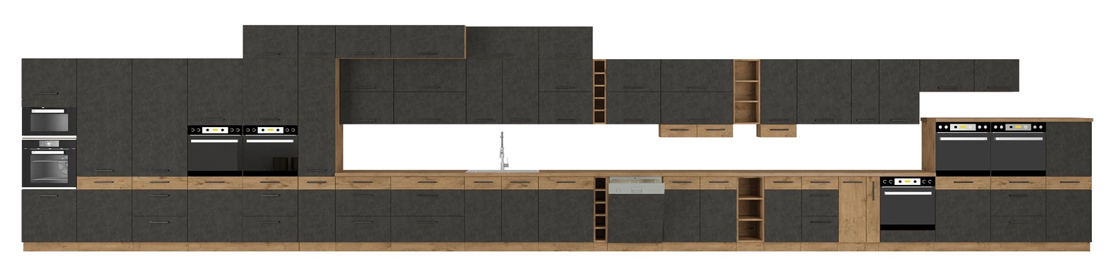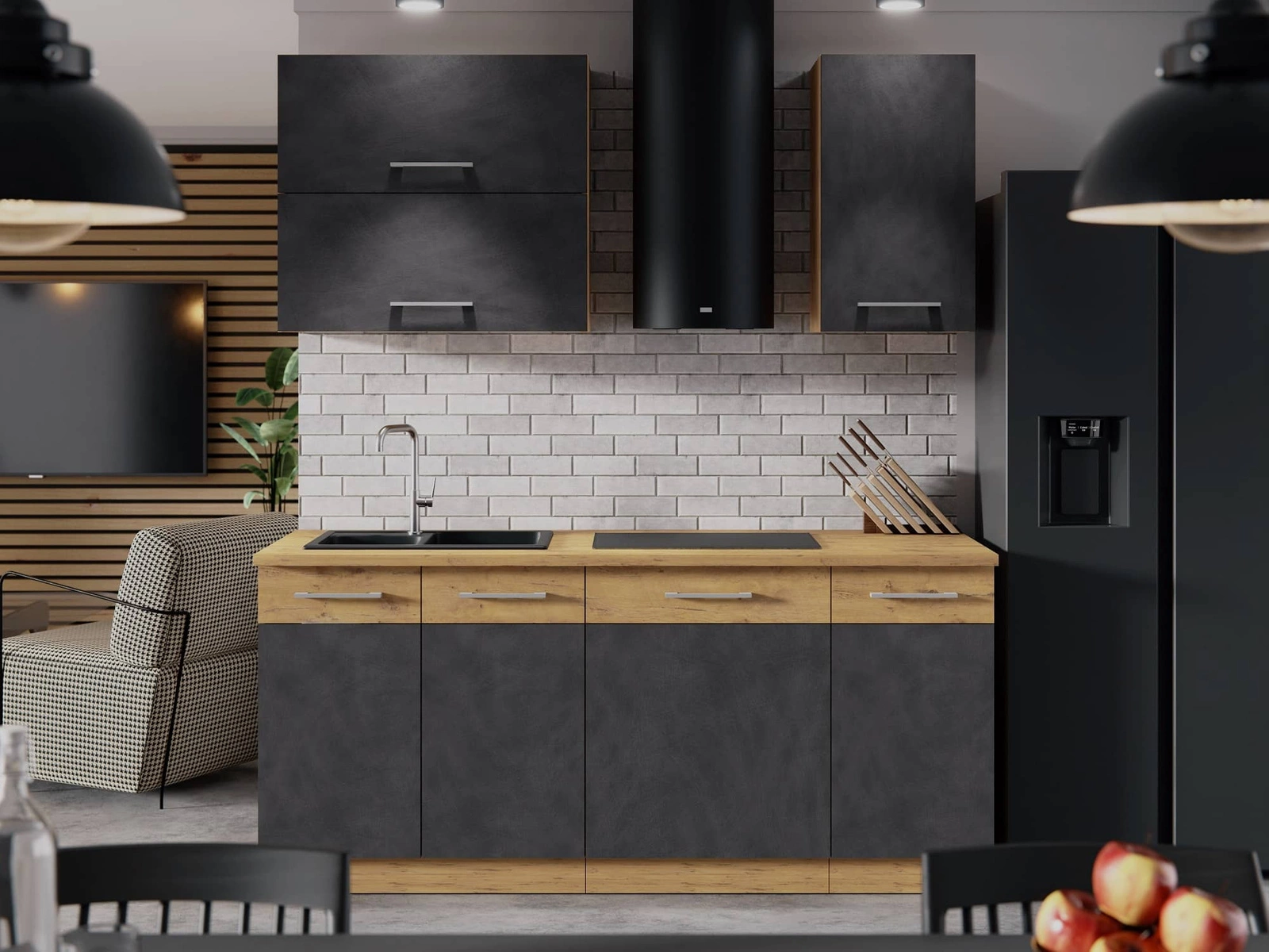 Dank ihrer universellen Positionierung passen die Küchenmöbel in das Innere einer jeden Küche. Mattfarbene Fronten und Korpusse im Eichendekor verleihen den Küchenmöbeln einen besonderen Charakter. Schwarz griffe betonen die Eleganz von Küchenschränken.