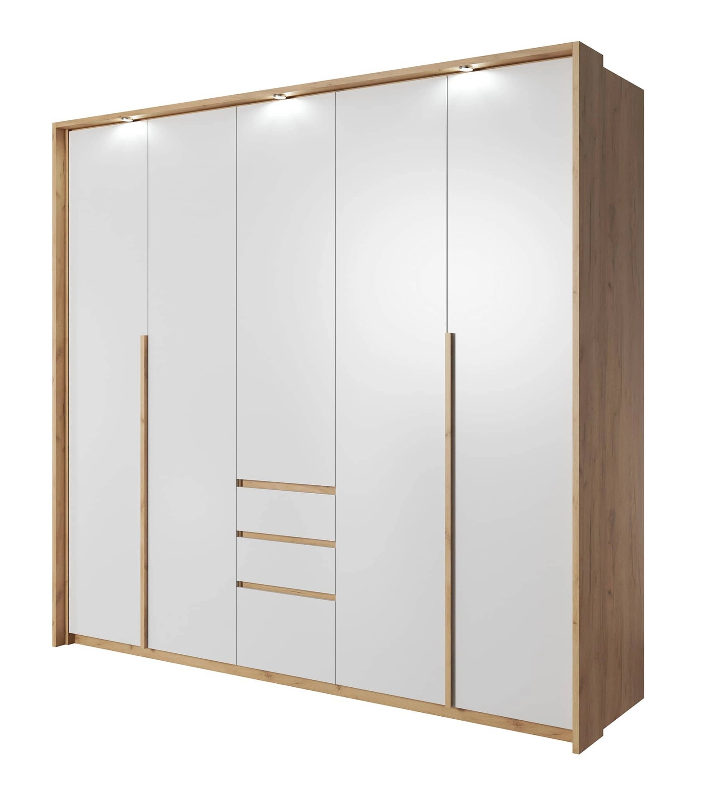 Das Schlafzimmermöbel-Set Novi in der Kombination aus Eiche Craft Gold und Weiß ist eine harmonische Verbindung von Klassik und Modernität, die perfekt in helle, geräumige Räume passt. Das Set umfasst einen geräumigen Kleiderschrank mit LED-Beleuchtung, ein Bett mit gepolstertem Kopfteil, Nachttische und eine funktionale Kommode - alles in einem einheitlichen Stil gehalten und mit Liebe zum Detail verarbeitet. Die hellen Fronten kontrastieren wunderschön mit dem warmen Holzton, was den Raum optisch vergrößert und ihm Frische verleiht. Dies ist die ideale Lösung für diejenigen, die Praktikabilität und Ästhetik in einem Möbelstück schätzen.