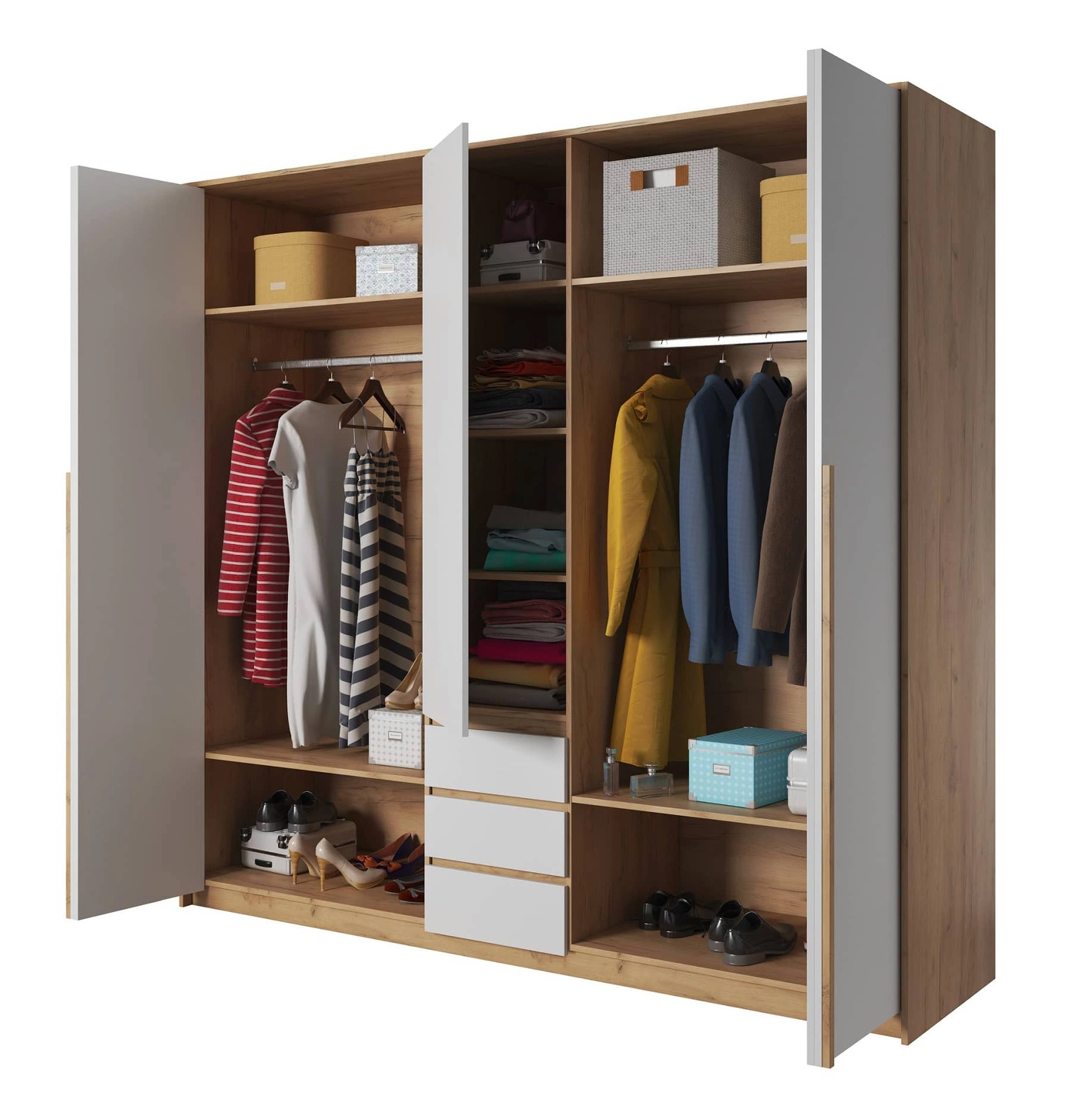 Die Schranktür wird durch ein innovatives System geöffnet wingLine Schiebe-Klapp-System. Das Novi Schlafzimmermöbel-Set garantiert störungsfreie Nutzung und die Langlebigkeit der einzelnen Blöcke für viele Jahre der Nutzung. Kombination von klassischem Weiß mit handgefertigter Eiche großartig die Novi-Möbel lassen sich mit anderen Farben kombinieren, was sie zu einem perfekten beweisen kann als Schlafzimmermöbel-Set oder als Möbel für ein Jugendzimmer verwendet werden.