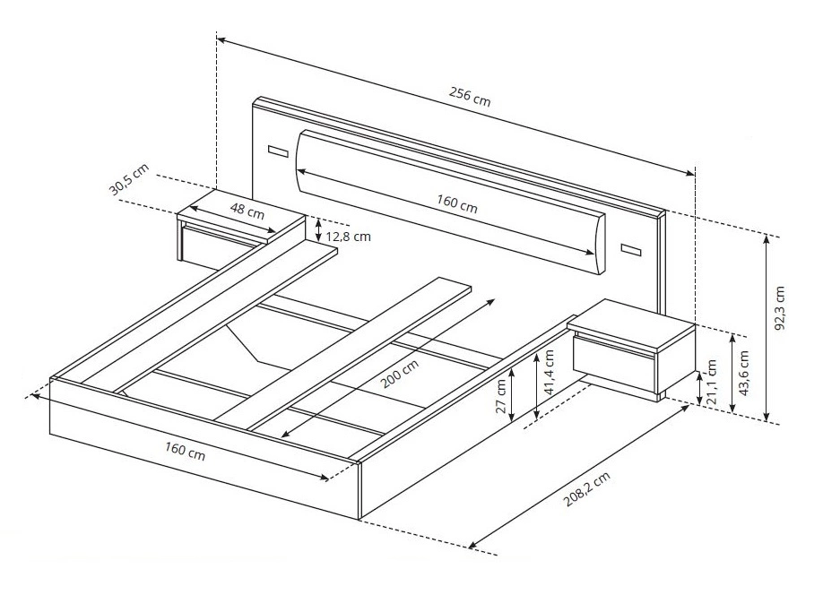 Die Möbel wurden aus hochwertiger laminierter Karton, die resistent gegen äußere Einflüsse wie Druckstellen, Stöße und unglückliche Kratzer ist. Bettkonstruktion mit teilweise kopfstütze gepolstert gewährleistet eine hohe Stabilität und einen hohen Nutzungskomfort. Das Bett ist ausgestattet mit stabiler Holzrahmen unter der Matratze. Im Lieferumfang des Bettes sind zusätzlich enthalten zwei Nachttische, die visuelle Leichtigkeit durch interessantes Design vermitteln. Das Bett und der Kleiderschrank sind mit dezenter lED-Beleuchtung.