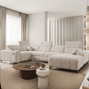 Ecksofa mit Schlaffunktion Penejos XII cremefarben linksseitig stilvolles Ecksofa mit Bettzeugcontainern komfortable verstellbare Kopfstützen
